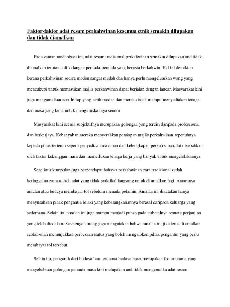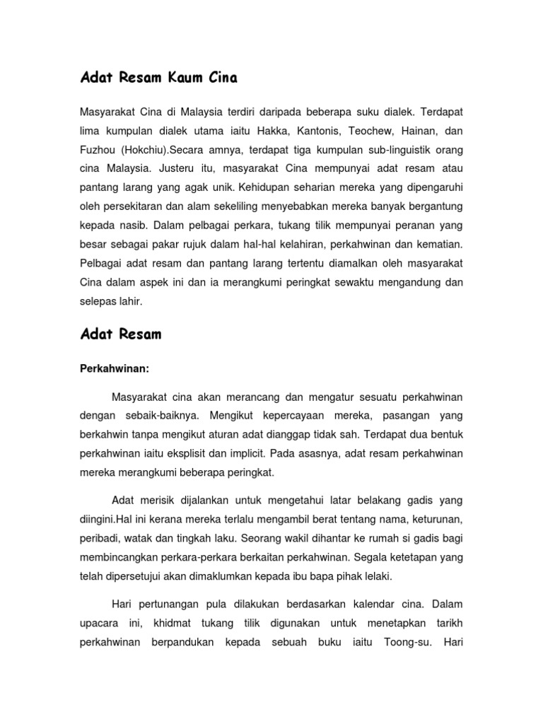 So please help us by uploading 1 new document or like us to download Adat resam yang di amalkan oleh masyarakat india mempunyai banyak persamaan dengan kebudayaan masyarakat melayu. Adat resam dan istiadat kahwin melayu adalah antara adat resam yang masih dipegang teguh oleh masyarakat kaum melayu sehingga kini tidak kira di jadi, tidak hairanlah adat resam dan istiadat perkahwinan tradisional juga menerima tempias arus kemodenan ini hingga tampil berbeza jika. Masyarakat cina mempunyai adat resam atau pantang larang yang agak unik. Budaya adat resam masyarakat cina masyarakat cina orang cina di malaysia merupakan kaum yang kedua besar di negara ini.