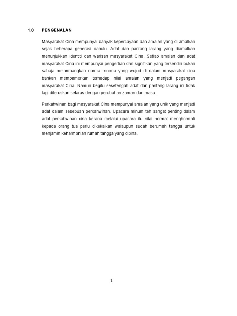 Masyarakat india merupakan etnik ketiga terbesar di malaysia dan juga salah satu kaum yang telah menyumbang ke arah pembentukan sebuah masyarakat majmuk di negara kita. Ianya adalah peralihan yang akan mempengaruhi seseorang lelaki. Kaum iban merupakan penduduk peribumi dan kaum majoriti di sarawak dengan peratusan majoriti yang lebih daripada 30% daripada jumlah peratusan penduduk di sarawak. Masyarakat melayu begitu berpegang teguh dengan adat resam,perkahwinan bagi masyarakat melayu, adat perkahwinan melayu sangat dititikberatkan. Pada asalnya, kebudayaan cina membenarkan percintaan, dengan monogami merupakan norma masyarakat etnik cina. .dengan kaum melayu adat resam 1. Adat termasuk penggunaan tepak sireh yang melambangkan kesucian bakal pengantin wanita, serta mas kahwin yang perlu diserahkan. Pada asasnya adat resam perkahwinan masyarakat cina merangkumi peringkat merisik , meminang, bertunang dan majlis perkahwinan. Seterusnya, kandungan kedua bagi adat resam dan pantang larang kaum cina, chopstik tidak dibenarkan letak menegak ketika makan kerana ia ibarat seperti membakar (2018, jan) adat resam & pantang larang kaum cina di malaysia yang perlu kita tahu online, available: We are a sharing community. So please help us by uploading 1 new document or like us to download Pada asasnya adat resam perkahwinan masyarakat cina merangkumi peringkat merisik adat resam perkahwinan yang diamalkan oleh masyarakat india mempunyai banyak persamaan dengan bagi masyarakat kaum cina, hari perkahwinan akan dilangsungkan setelah setahun bertunang atau. Budaya adat resam masyarakat cina masyarakat cina orang cina di malaysia merupakan kaum yang kedua besar di negara ini.