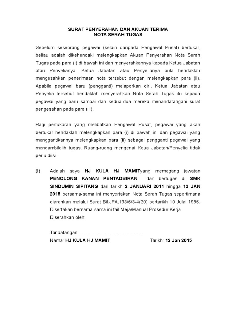 Disertakan juga bersamasama ini fail meja / manual prosedur kerja*. 2010 sehingga pada 27 disember 2013. Contoh surat penangguhan lapor diri by cikgu hailmi 90826 views. Untuk cikgu yang dapat pertukaran bolehlah download nota serah tugas untuk membuat persaipan bertukar ke sekolah baru. Surat penyerahan dan akuan terima nota serah tugas 2. Nota serah tugas ini juga merupakan arahan oleh jabatan perkhidmatan awam bagi penjawat awam yang berpindah atau bertukar. Kedudukan terakhir tugas tugas yang belum selesai 4. Nota serah tugas untuk digunapakai oleh guru yang dapat bertukar. Serah tugas guru by intan idora 4926 views. Surat penyerahan dan nota akuan terima nota serah tugas. We are a sharing community. Bagi seorang guru yang berpindah sudah pastilah wajib membuat nota serah tugas ini, supaya segala tanggungjawab yang dipikul sebelum ini dapat diamanahkan. Nota serah tugas seperti seperti yang diarahkan oleh jabatan perkhidmatan.