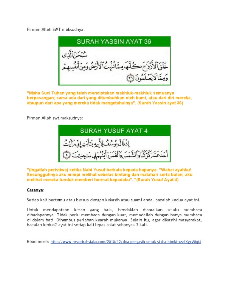 Untuk itu saya akan memberikan beberapa saran tentang cara membaca doa pengasihan surat yusuf ini. Wa alqaytu 'alayka mahabbatan minni walitushna'a' 'ainii. Surat ini dinamakan surat yusuf adalah karena titik berat dari isinya mengenai riwayat nabi yusuf. Banyak para ahli hikmah mengatakan, baca surat yusuf ayat 4 jika kamu ingin mempunyai pesona dan daya tarik. Mari lah kita amalkan ayat pengasih surah yusuf ayat 4 dan surah thahaa ayat 39 seperti di bawah ini. Berbagai macam amalan dalam ayat ayat al qur'an yang bisa digunakan untuk memikat hati wanita atau memikat hati pria. Cara mengamalkan doa pengasihan nabi yusuf. 39 seperti di bawah ini. Rahsia ayat pengasih nabi yusuf. Ingatlah ketika yusuf berkata kepada ayahnya, wahai ayahku, sesungguhnya aku bermimpi melihat sebelas buah bintang, matahari dan bulan kelihatan semuanya sujud kepadaku. Ayat pengasih nabi yusuf wa nuuru yusufa 'ala wajhi, famarrani yuhibbuni(dan nur(cahaya) yusoff pada wajahku maka gerakkan lah dia kepada ku dan mengasihiku) ayat 31 dlm surah ali imran pun boleh jadikan ayat pengasih lepas qul in kuntum tuhibbunallaha fattabi 'uu nii (niatkan nama org tu. Doa kecantikan untuk menaikan seri wajah atau muka daripada surah nabi yusuf. Bagi sesiapa yang mengkehendaki supaya muka atau wajah nya berseri perlulah ia membaca surah yusuf ayat 4 (sebaik baiknya selepas solat).