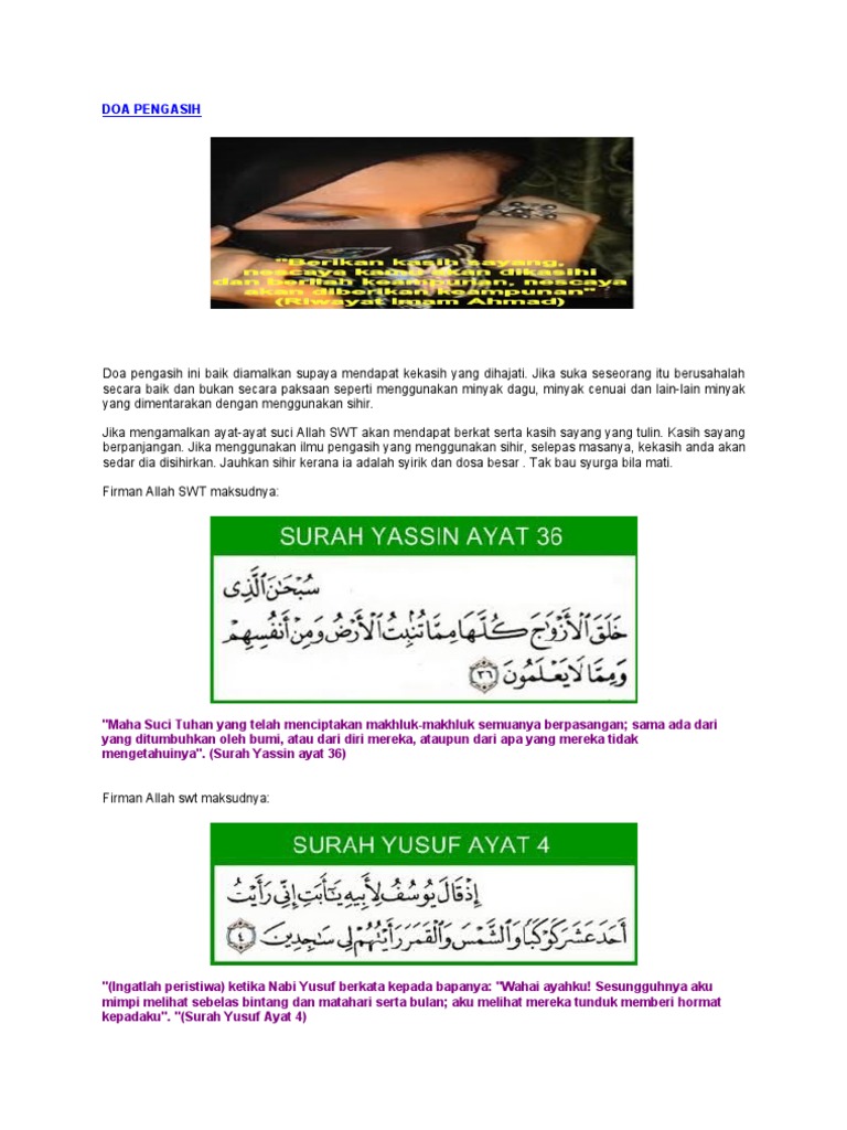 Berikut doa pengasihan nabi yusuf tingkat tinggi, doa pengasihan tanpa puasa, pengasihan nabi yusuf ayat 31, serta pengasihan. Tak hanya wajahnya yang rupawan, hati. Wa alqaytu 'alayka mahabbatan minni walitushna'a' 'ainii. Ayat pengasih nabi yusuf wa nuuru yusufa 'ala wajhi, famarrani yuhibbuni(dan nur(cahaya) yusoff pada wajahku maka gerakkan lah dia kepada ku dan mengasihiku) ayat 31 dlm surah ali imran pun boleh jadikan ayat pengasih lepas qul in kuntum tuhibbunallaha fattabi 'uu nii (niatkan nama org tu. Bacalah surah yusuf ayat 4 yang berbunyi bermaksud: