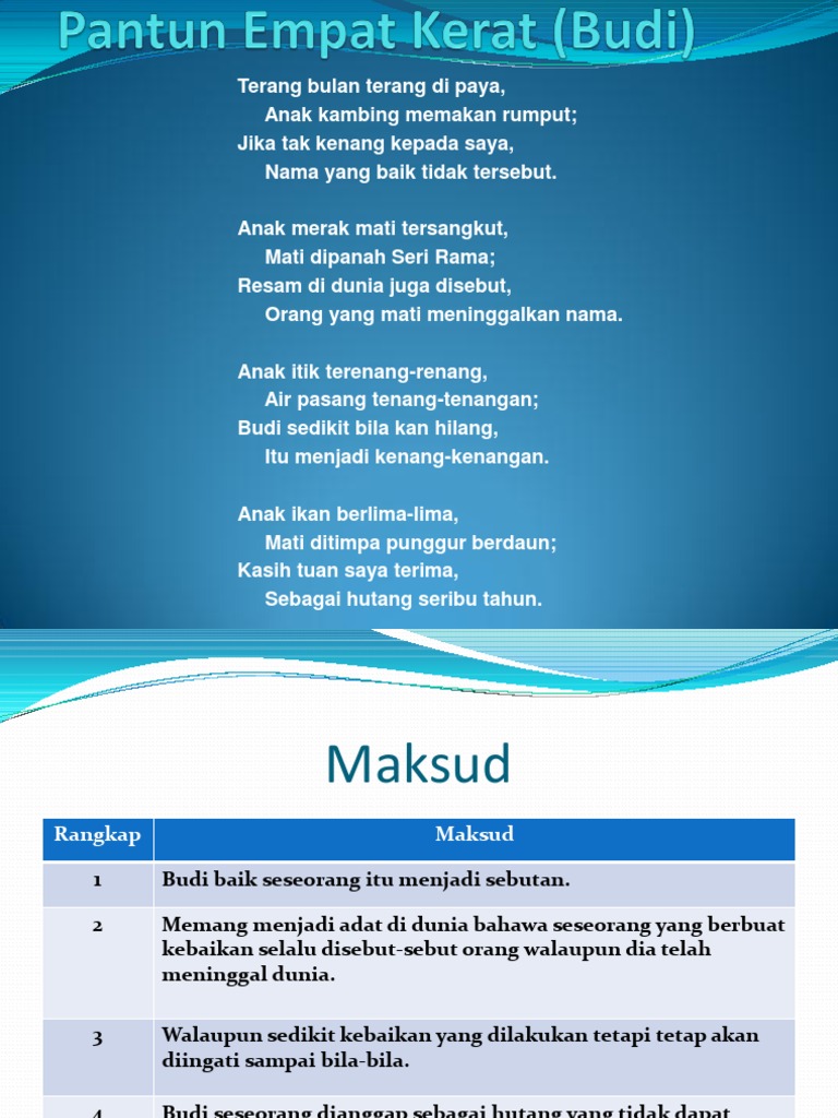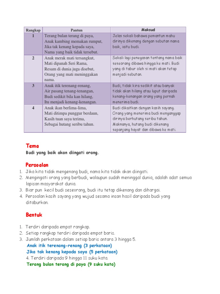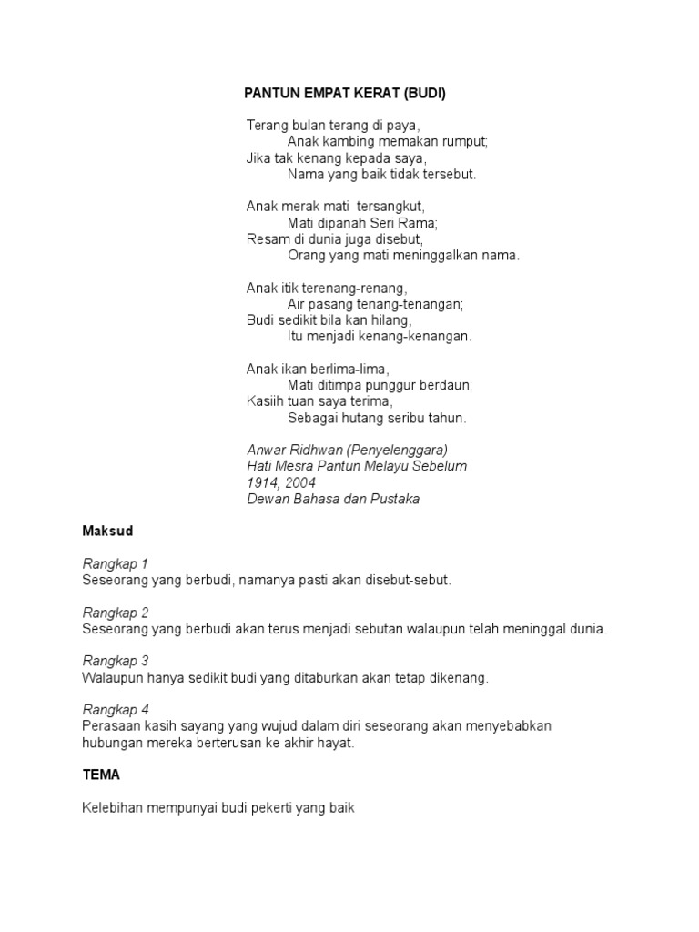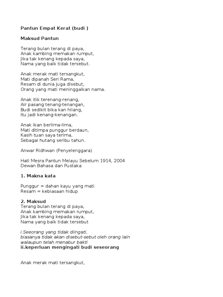 Maksud budi baik yang diterima tidak dapat dibalas walaupun seribu tahun. Dalam pantun empat kerat (budi) ini. Terang bulan terang di paya, anak kambing memakan rumput; Pantun lawak jangan takut jangan khuatir, ini kentut bukan petir. Puisi tradisipantun empat kerat budi. Antologi tingkatan 2 baik budi bahasa, indah bahasa pendeklamasi puisi tradisional direka cipta oleh myteach sdn. Jika tak kenang kepada saya, nama yang baik tidak tersebut. Terang bulan terang di paya, pantun ini disampaikan sebagai pesanan tidak langsung bahawa orang yang anak kambing memakan rumput, berbudi hendaklah dikenang. 8 tema kepentingan hidup berbudi. Ambil galah jolok ramunia, kait mari sampai berdiri, kita hidup atas dunia, buat baik taburkan budi. Anak merak mati tersangkut, mati dipanah seri rama, resam di dunia juga disebut. Pantun maksud terang bulan terang di paya anak kambing memakan rumput. 1 pantun empat kerat (budi) terang bulan terang di paya, anak kambing memakan rumput;